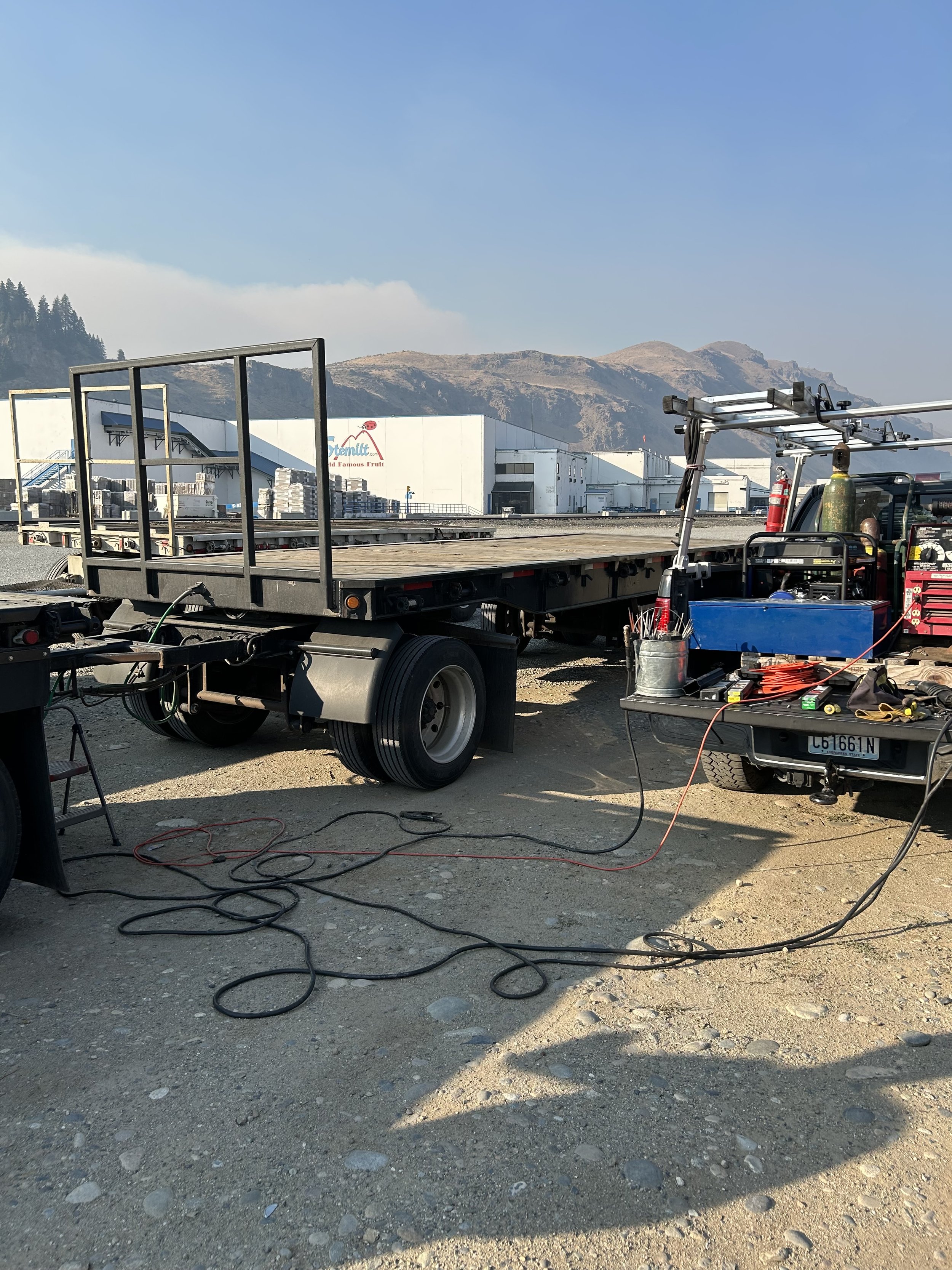 Automobile being welded on a repair shop to fix the front end damage, with bright welding sparks and equipment visible.